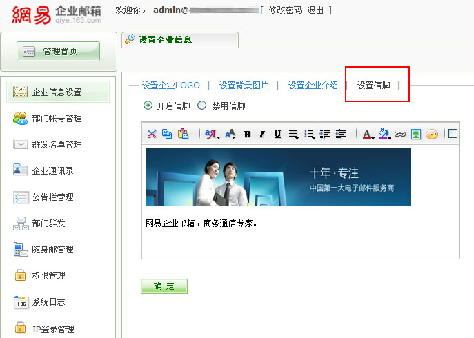 管理员可在“企业信息设置”的“设置信脚”处,选择开启或禁用信脚,在开启的状态下,可为企业设置统一信脚,支持图文编辑模式。