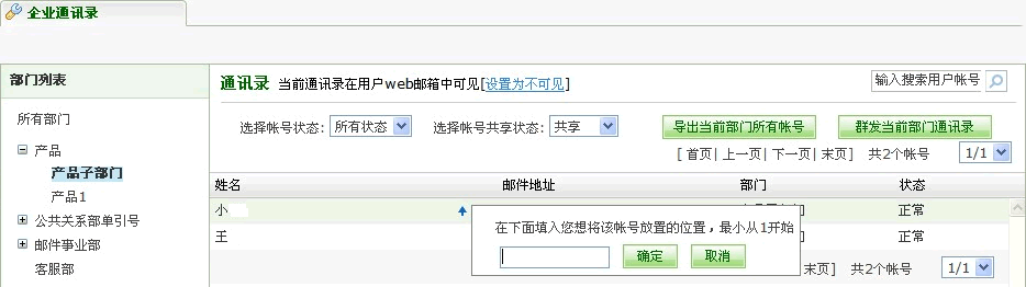 更新后,企业管理员可在管理后台的“企业通讯录”中选择需要操作的部门,鼠标移至想要自定义顺序的用户姓名后,点击箭头并输入相应的数字后,该用户即显示在此部门的相应位置(用户登录后邮箱后在写信页面查看通讯录时即显示最新排序)。该功能主要应用于把部门领导或其他特定人员优先显示于该部门前列(其他用户将按照邮箱帐号的昵称顺序排列)。